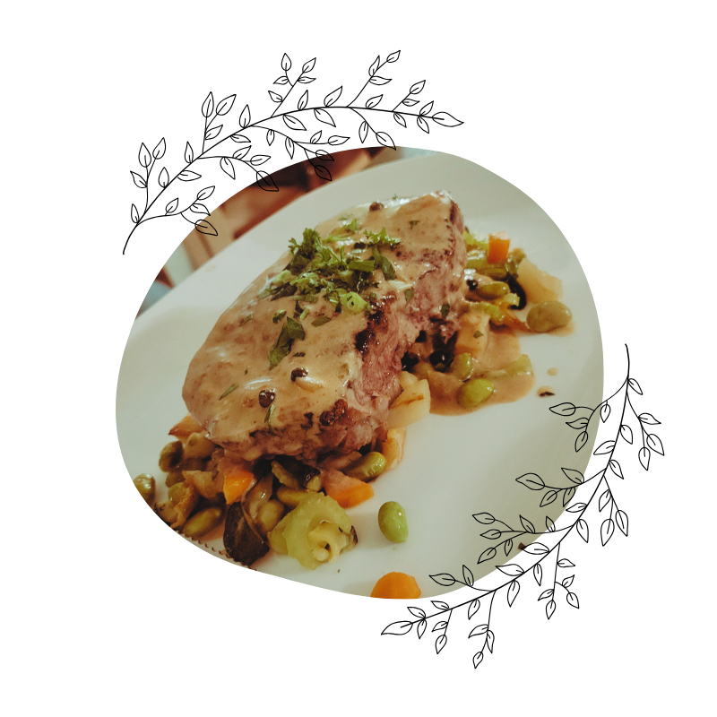 Zart und saftig gegrillt, mit Pfefferrahmsauce, „Großmutters Pommes frites“ und frischem Gartengemüse.